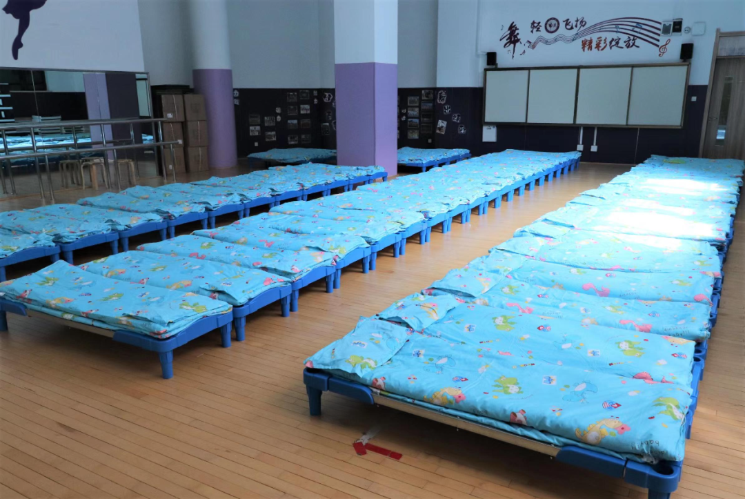 光明小学将舞蹈教室中午开放为午休室,学生的午休床已放置好。新华社记者 李紫薇 摄