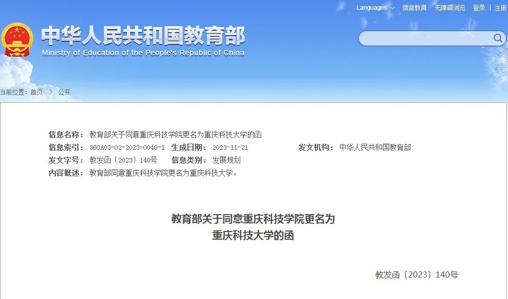 根据《中华人民共和国高等教育法》《普通高等学校设置暂行条例》《普通本科学校设置暂行规定》有关规定以及第八届全国高等学校设置评议委员会评议结果,经教育部党组会议研究决定,同意重庆科技学院更名为重庆科技大学,学校标识码为4150011551;同时撤销重庆科技学院的建制。