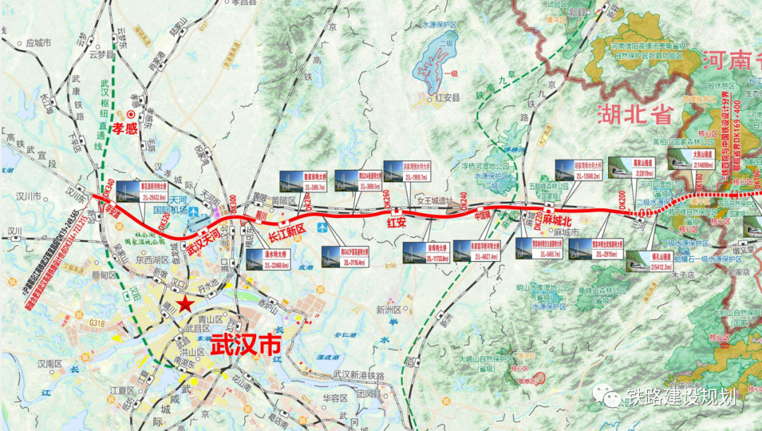 本段新建正线长163.350km,设车站4座:麻城北、红安、长江新区、武汉天河。