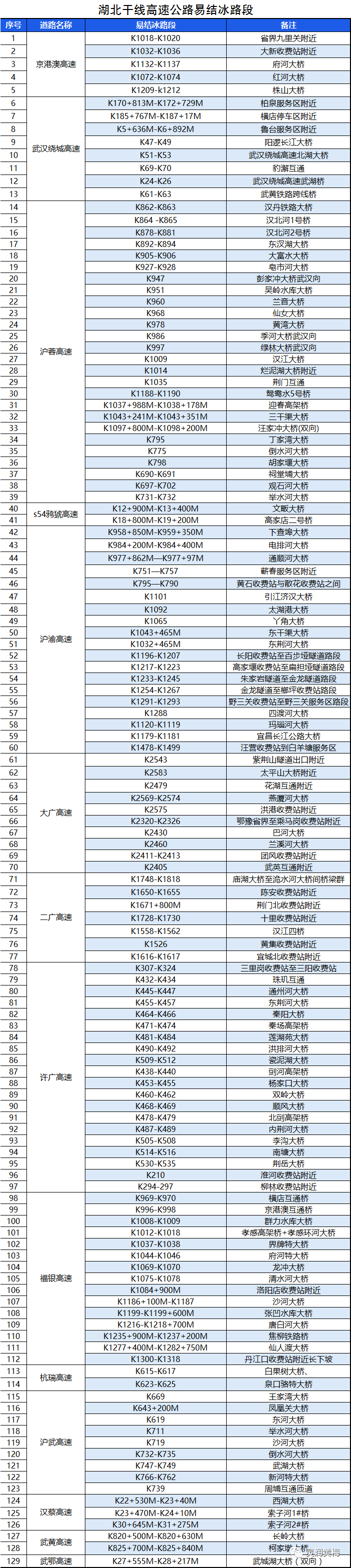 据最新气象资料显示,本周末湖北省范围内风力减弱,雨雪退场,但低温仍将持续。12月16日,鄂西北零星小雪转多云,鄂西南、鄂东南南部阴天有小雪。其中恩施高海拔地区有中雪,周日早晨的最低气温,北部仅-9~-5℃,南部-4~-1℃。雪后凝冻,道路易结冰,尤其是高速公路桥梁路段,行驶时应格外谨慎。针对冰雪天气给行车安全带来的不利影响,12月16日,湖北省公安厅高速公路警察总队紧急发布湖北省范围内高速公路易结冰路段风险提示,提请驾驶人行经时做好防范措施。湖北高速交警紧急提醒:这129处湖北干线高速公路易结冰段行车一定要注意!