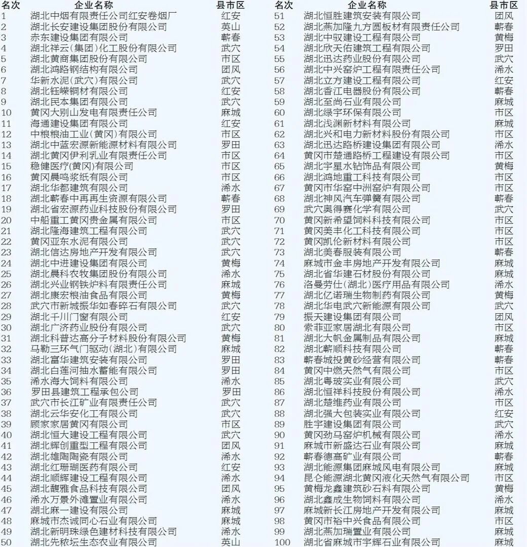 2023(第十届)黄冈企业100强排序工作3月下旬启动,以全市企业2022年统计信息为基本依据(不含中央在黄冈的分〈子〉公司、金融业),按照企业申报,市企业联合会、市企业家协会相关部门综合审核的程序,以2022年营业收入(占比50%)、税收(占比40%)、就业人数(占比10%),确定前100名为“2023(第十届)黄冈企业100强”名单。现予发布。