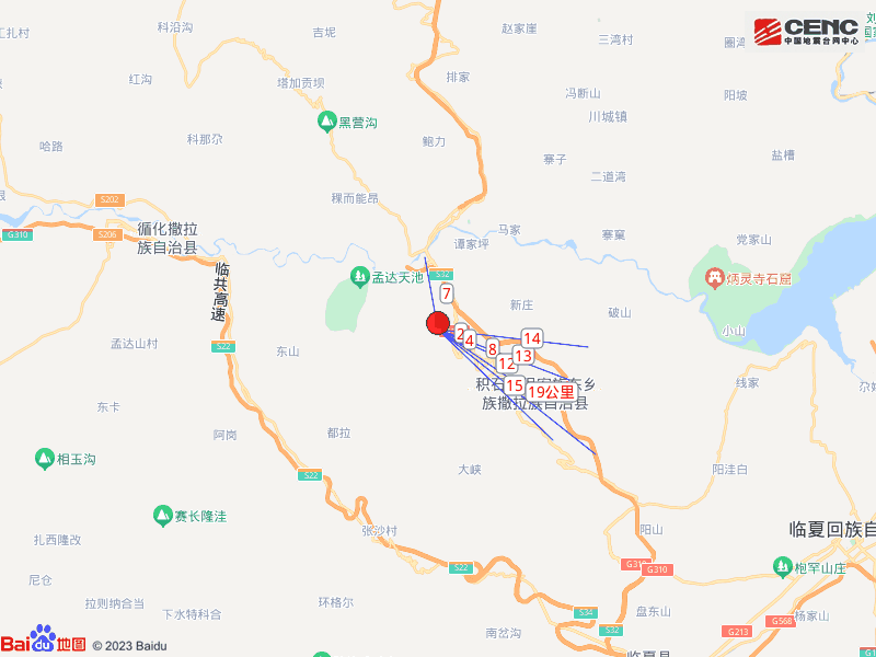 震中距积石山保安族东乡族撒拉族自治县11公里、距青海循化撒拉族自治县27公里、距临夏县41公里、距临夏市46公里、距永靖县50公里,距临夏回族自治州44公里,距兰州市99公里。