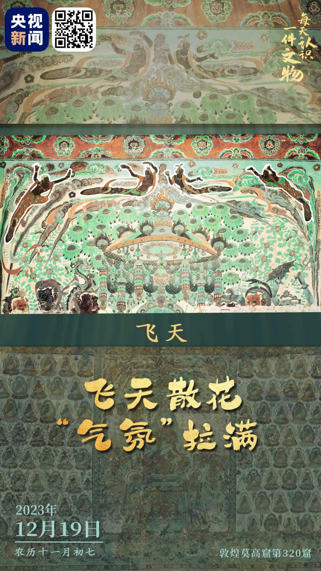 甘肃敦煌莫高窟第320窟南壁上,画师巧妙地利用了画面上沿狭窄的空白,让这四身飞天以对称的形式在空中飞翔。四身飞天两两成组,前者回首顾盼、扬手散花,后者举臂腾飞、追赶嬉戏,充满欢乐、自由、吉祥的气氛,尽显盛唐之美。