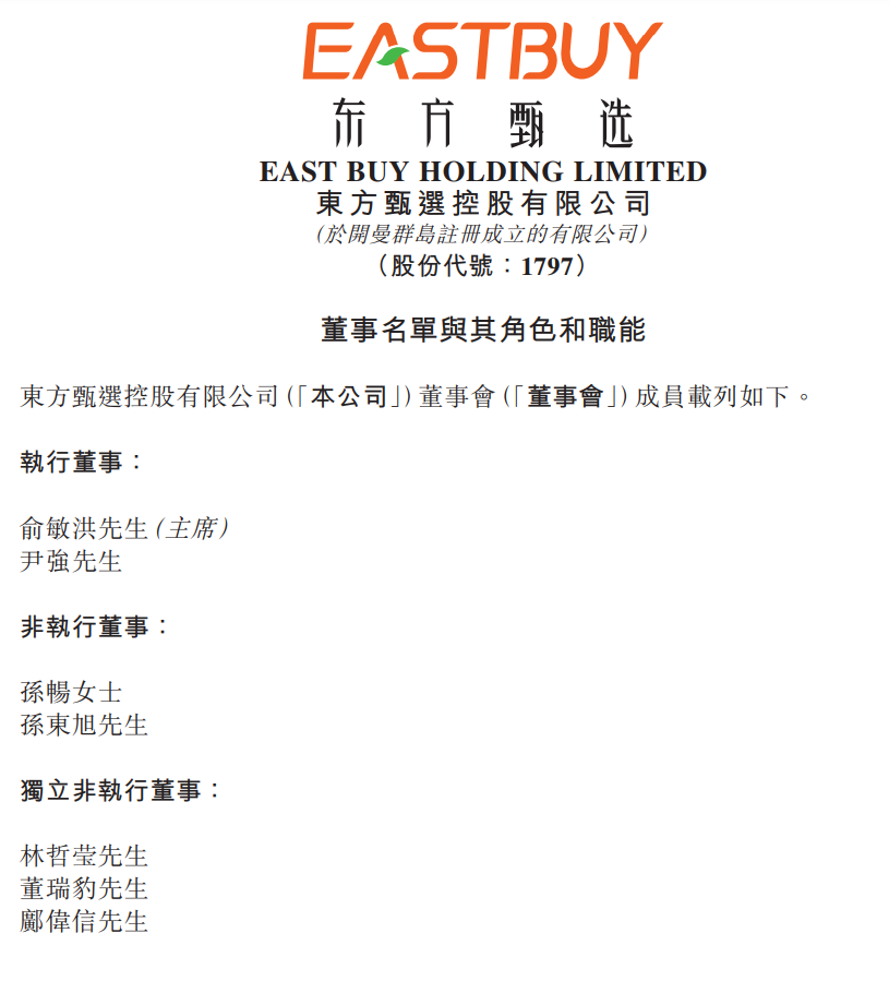 在同日另一份公告中,东方甄选披露了董事会成员名单。其中,执行董事有俞敏洪(主席)、尹強,非执行董事有孙畅、孙东旭,独立非执行董事有林哲莹、董瑞豹、邝伟信。