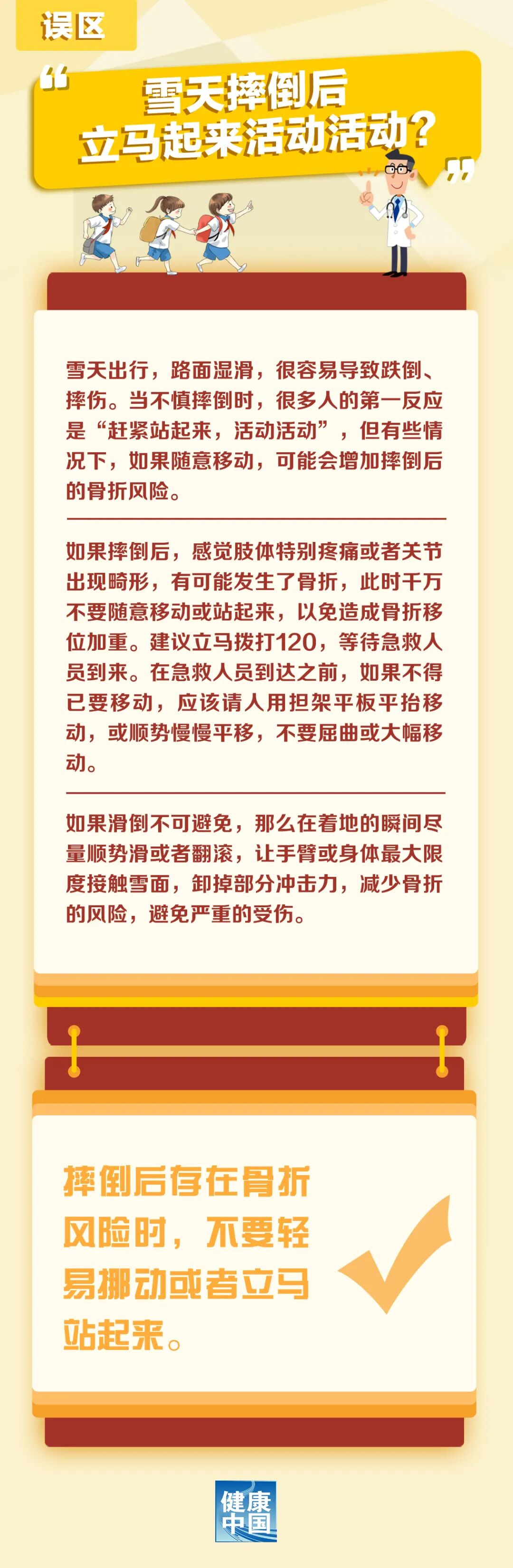 雪天路面湿滑,一不小心摔倒的情况并不少见。有不少网友疑问:雪天摔倒后,要立马站起来,活动活动吗?