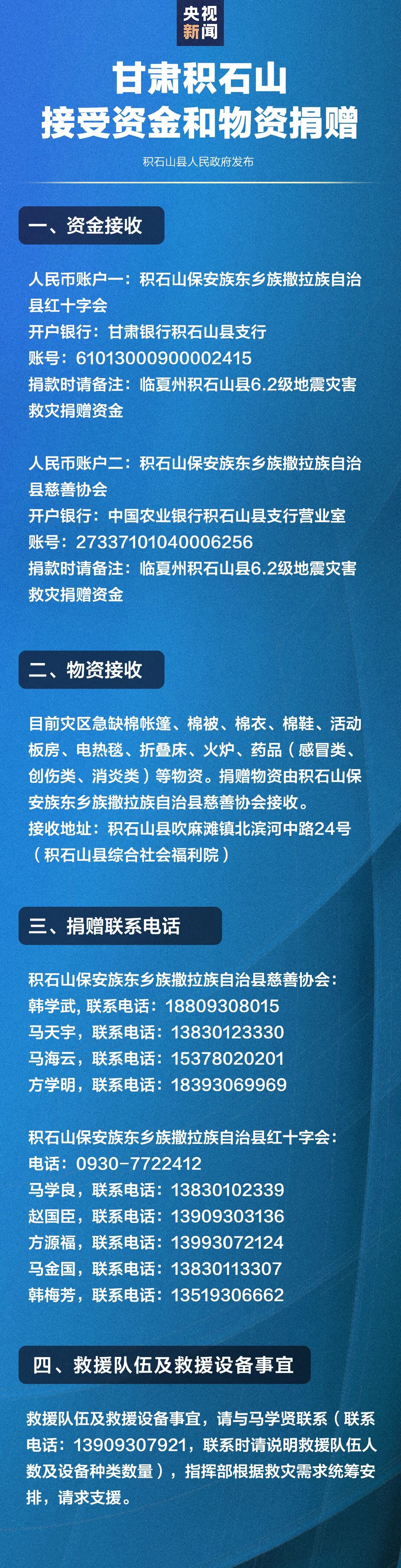 19日,甘肃临夏州积石山县发布公告,公布面向社会接受资金和物资捐赠方式。