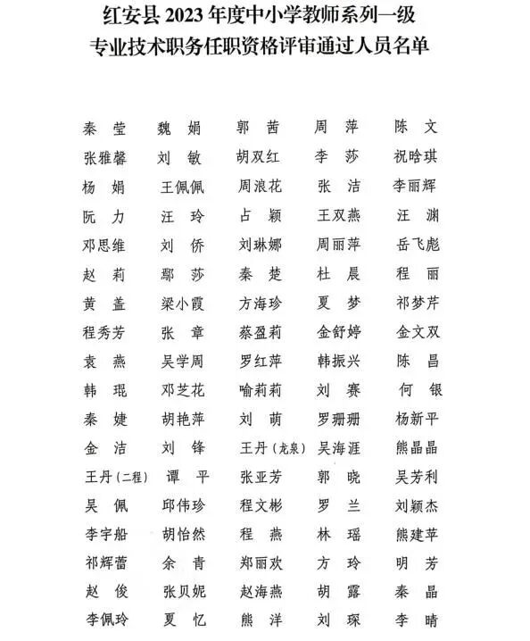 附:红安县2023年度中小学教师系列一级专业技术职务任职资格评审通过人员名单