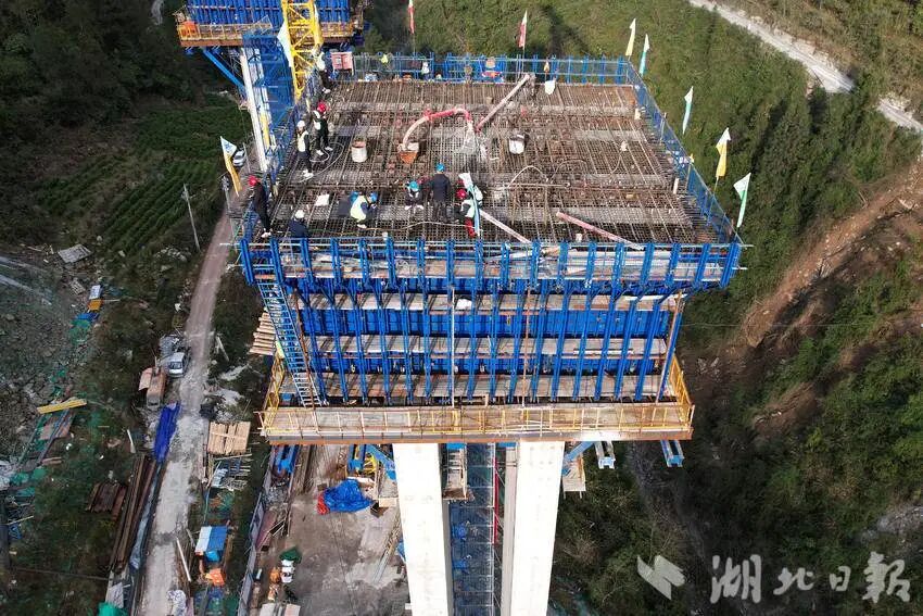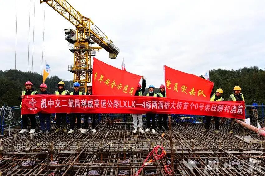 12月19日,咸丰县小村乡李子溪村境内,中交二航局的建设者正抢晴浇筑利咸高速(利川至咸丰高速公路)两洞桥大桥首个0号梁段。