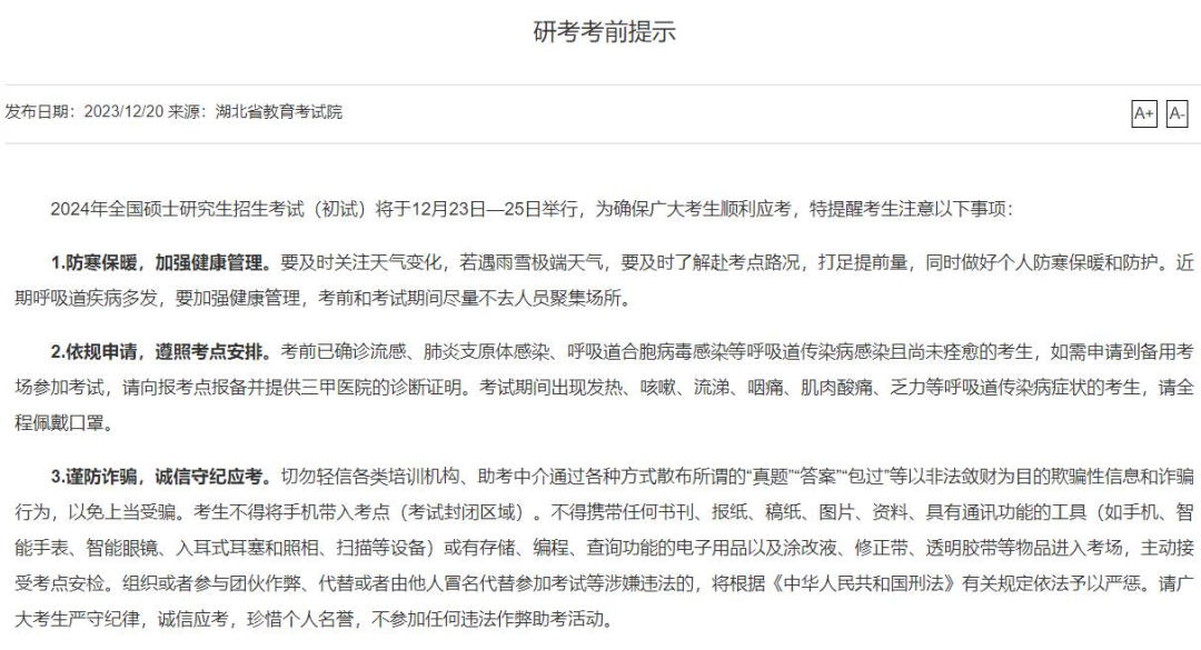 2024年全国硕士研究生招生考试(以下简称研考)将于12月23至25日举行。湖北省教育考试院20日发布温馨提示,提醒广大考生加强健康管理、遵照考点安排、诚信守纪应考。具体如下: