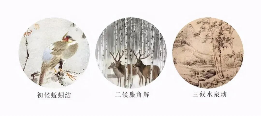 中国古代一些文学作品将冬至分为三候:“一候蚯蚓结”,此时阳气虽已生长,但阴气仍然强盛,土中的蚯蚓仍然蜷缩着身体。“二候麋角解”,古人认为麋的角朝后生,所以为阴,鹿的角朝前长属阳。继而认为,冬至时阴极阳生,麋感到阳气,头角会自动脱落。“三候水泉动”,冬至这天太阳光直射南回归线,是北半球各地白昼最短、黑夜最长的一天,冬至后太阳直射点往北回返,太阳往返运动进入新的循环,太阳高度自此回升、白昼逐日增长,所以此时山中的泉水可以流动并且温热。