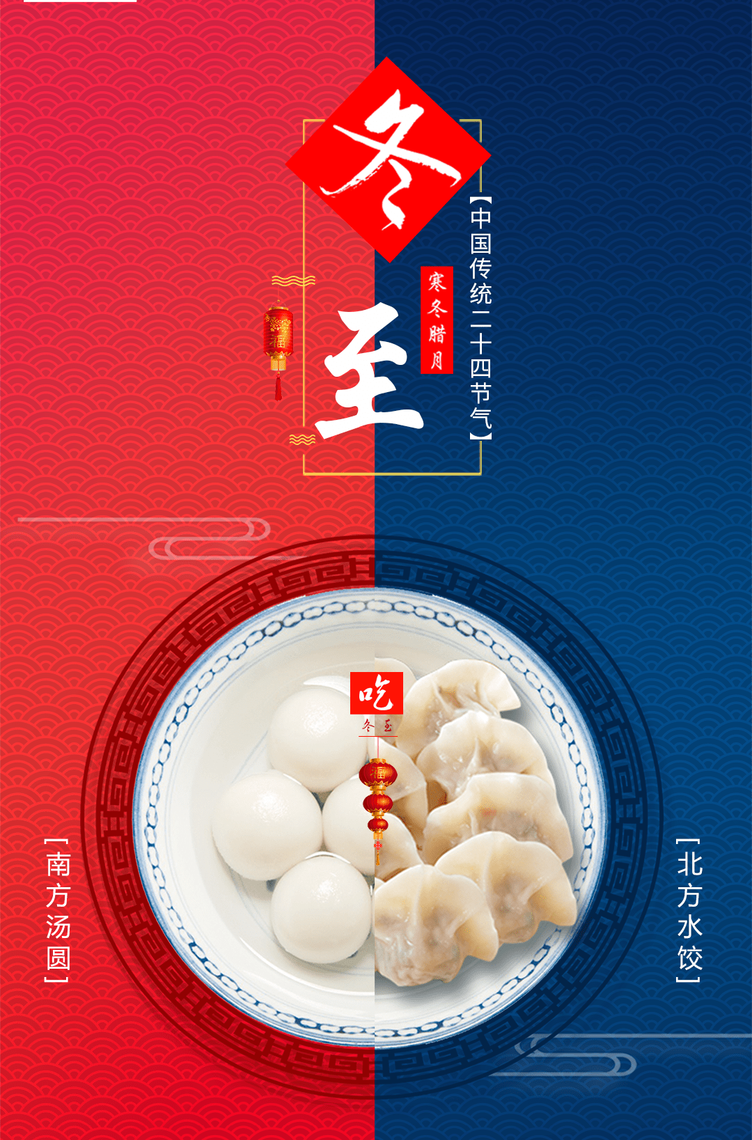 冬至习俗因地域不同存在着内容或细节上的差异。在中国北方地区,每年冬至日有吃饺子的习俗,俗话说:“冬至不端饺子碗,冻掉耳朵没人管”。在中国南方地区,有冬至祭祖、宴饮、吃汤圆等的习俗。除了节气习俗,在健康养生方面,冬至这一天同样也有着特殊的意义。
