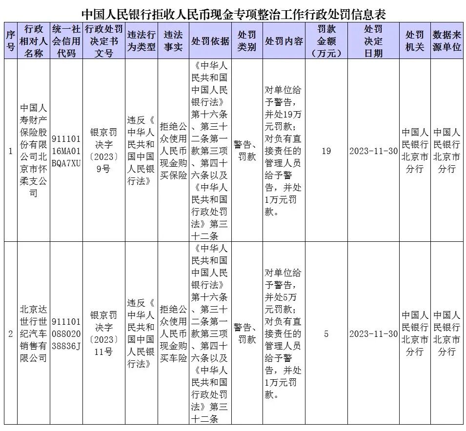 近日,中国人民银行依法对2家拒收人民币现金的单位及相关责任人作出经济处罚。