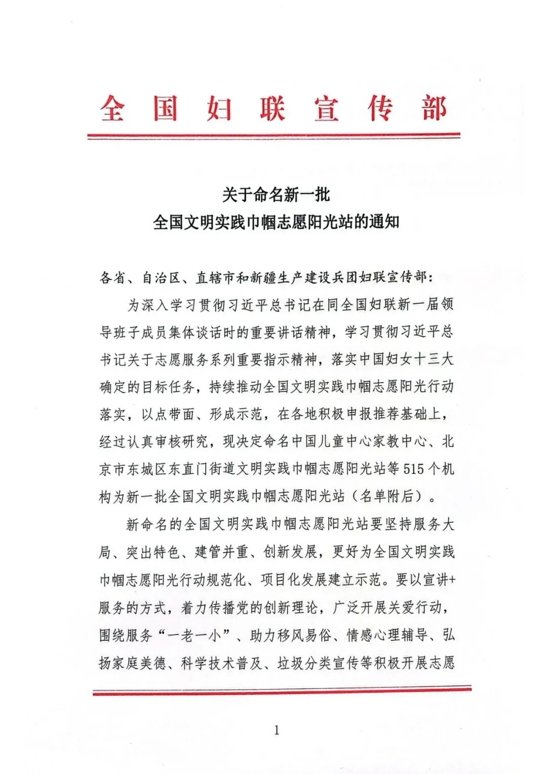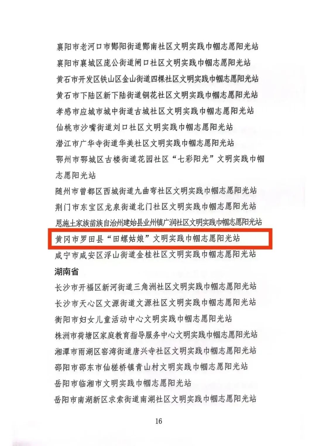 近日,全国妇联下发了《关于命名新一批全国文明实践巾帼志愿阳光站的通知》,决定命名中国儿童中心家教中心等515个机构为新一批全国文明实践巾帼志愿阳光站。其中,罗田县“田螺姑娘”文明实践巾帼志愿阳光站入选。