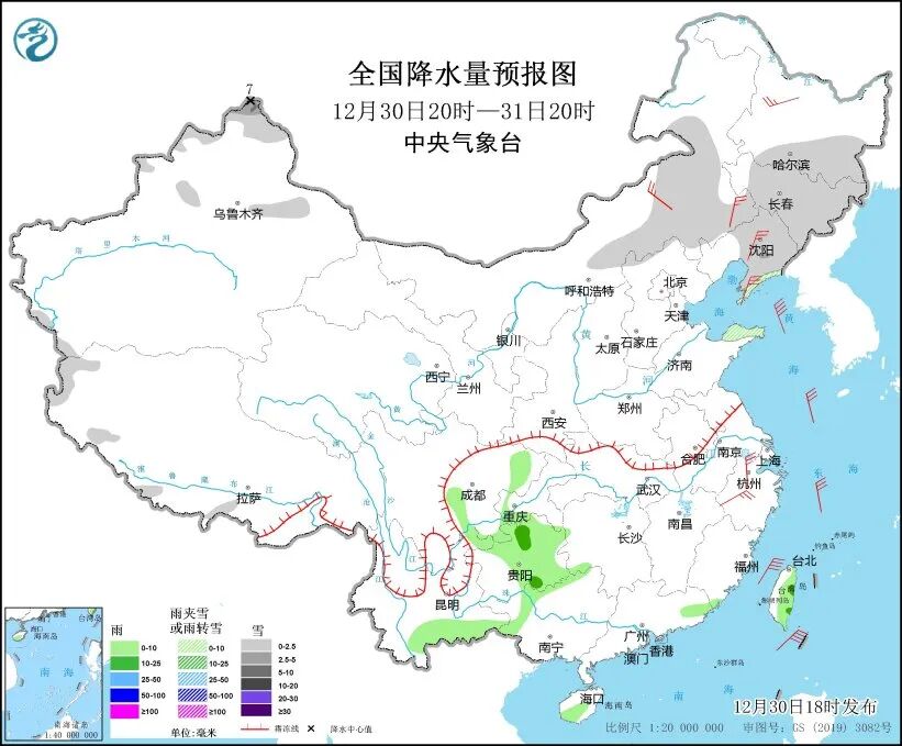 中央气象台预计,30日20时至31日20时,内蒙古中东部、东北地区中南部、新疆北疆北部和沿天山地区等地部分地区有小到中雪或雨夹雪,其中,新疆北疆北部等地局地有大雪。贵州北部和东部、云南南部、海南岛等地部分地区有小到中雨。