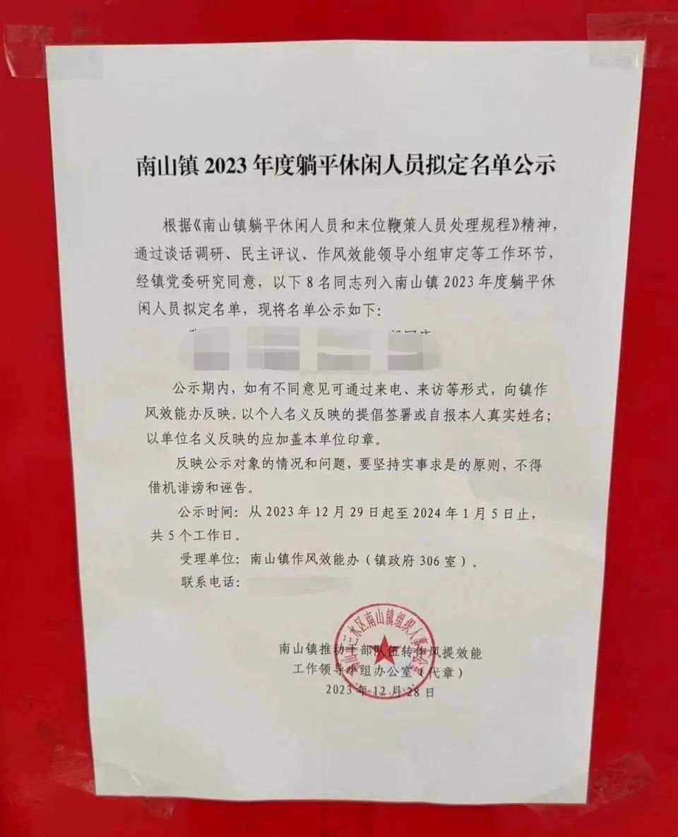 网传图片显示,南山镇作风效能办于2023年12月28日盖章公示《南山镇2023年度躺平休闲人员拟定名单》。该公示文章称,根据《南山镇躺平休闲人员和末位鞭策人员处理规程》精神,通过谈话调研、民主评议、作风效能领导小组审定等工作环节,经镇党委研究同意,有8名同志列入南山镇2023年度躺平休闲人员拟定名单。公示期内,如有不同意见可通过来电、来访等形式,向镇作风效能办反映。公示时间为2023年12月29日至2024年1月5日,共5个工作日。