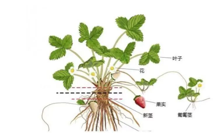 草莓整个一株包括根,花,叶子,果实,还有匍匐于地面生长的地上茎称为匍匐茎。