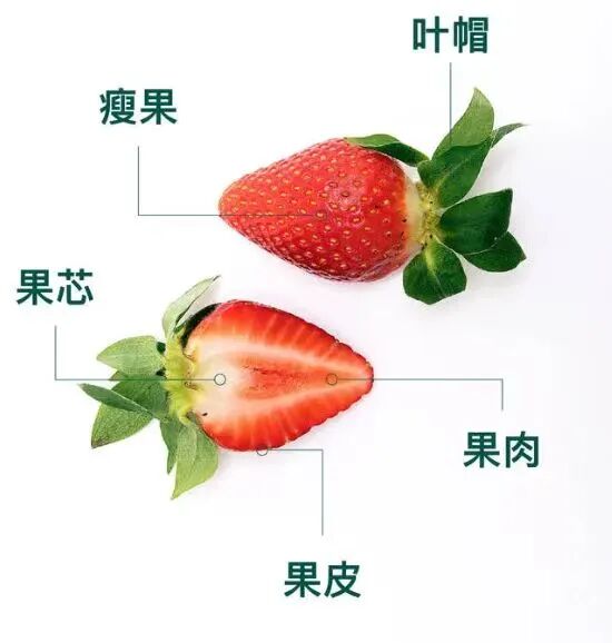 草莓的果蒂叫【叶帽】,草莓表皮像芝麻一样的叫【瘦果】。轻轻地剖开草莓,可以看到草莓的【果芯】和【果肉】。