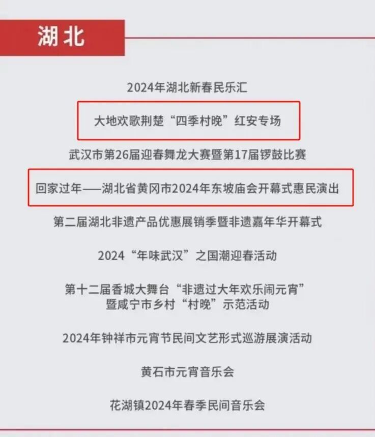 经过各省推荐、专家遴选,2024年第一季度国家公共文化云网络直录播入选名单出炉。我市《大地欢歌荆楚“四季村晚”红安专场》《回家过年——湖北省黄冈市2024年东坡庙会开幕式惠民演出》两项活动入选。