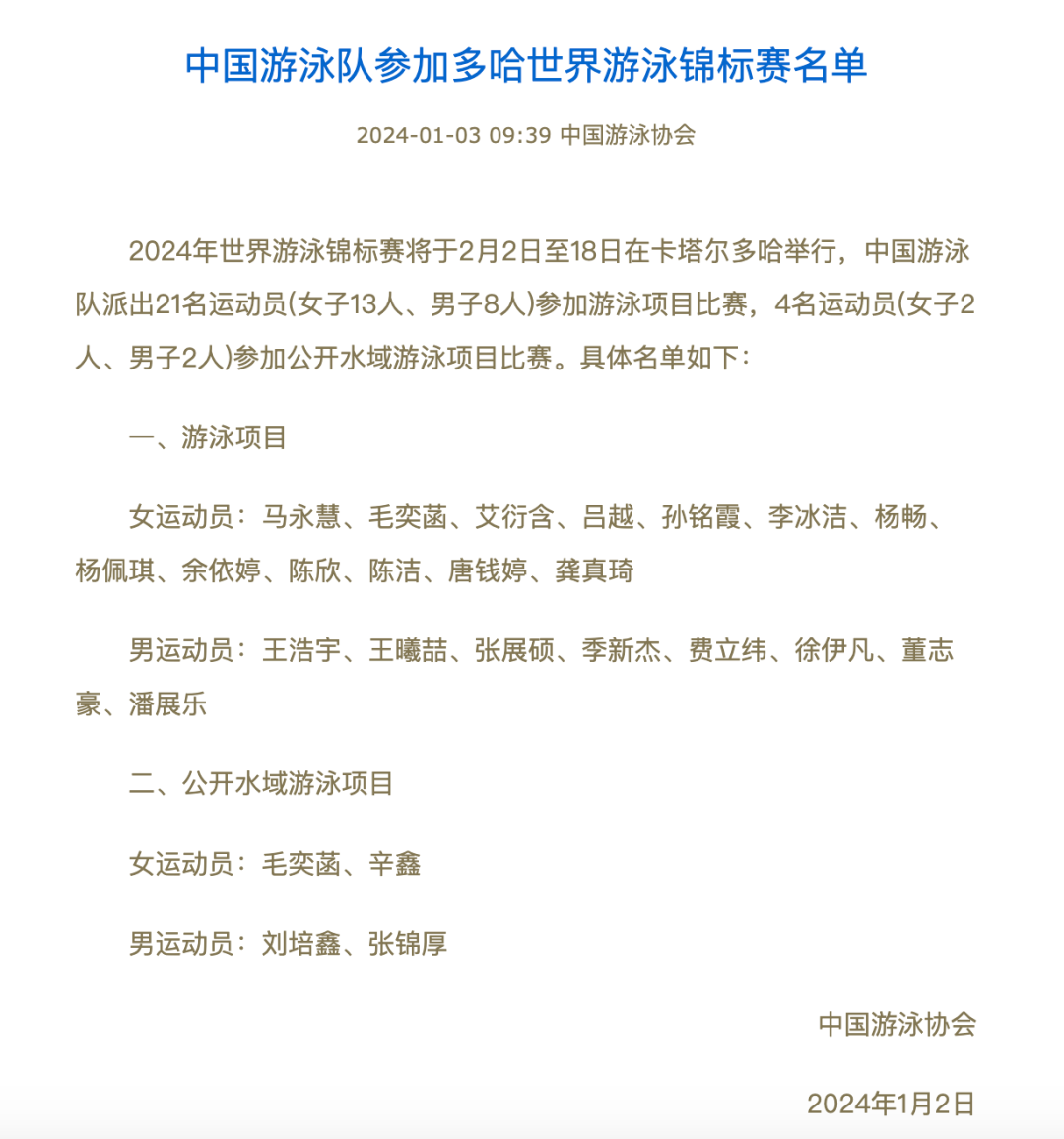 2024年世界游泳锦标赛将于2月2日至18日在卡塔尔多哈举行。日前,中国游泳协会公布游泳世锦赛中国队名单。
