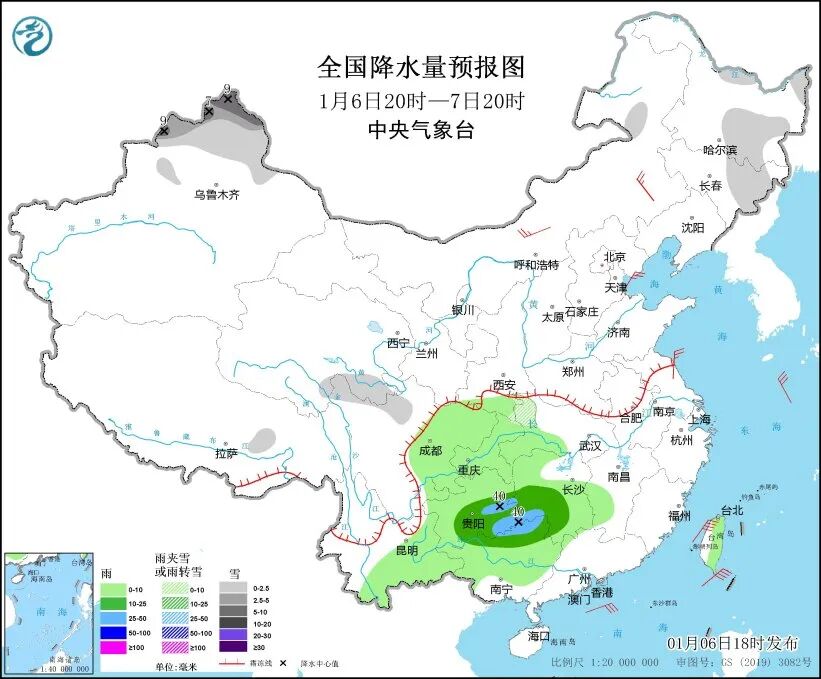 中央气象台预计,6日20时至7日20时,内蒙古东北部、黑龙江和吉林东部、新疆北部、青海南部、川西高原北部等地部分地区有小雪或雨夹雪,部分地区有中到大雪。贵州东部、湖南西部、广西北部等地部分地区有中到大雨。