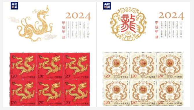 5日,中国邮政发行《甲辰年》特种邮票。邮票一套两枚,图案分别为“天龙行健”和“辰龙献瑞”。
