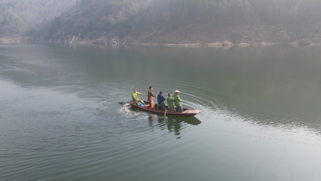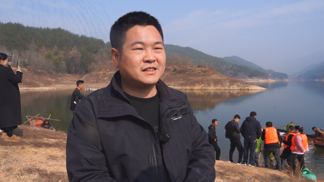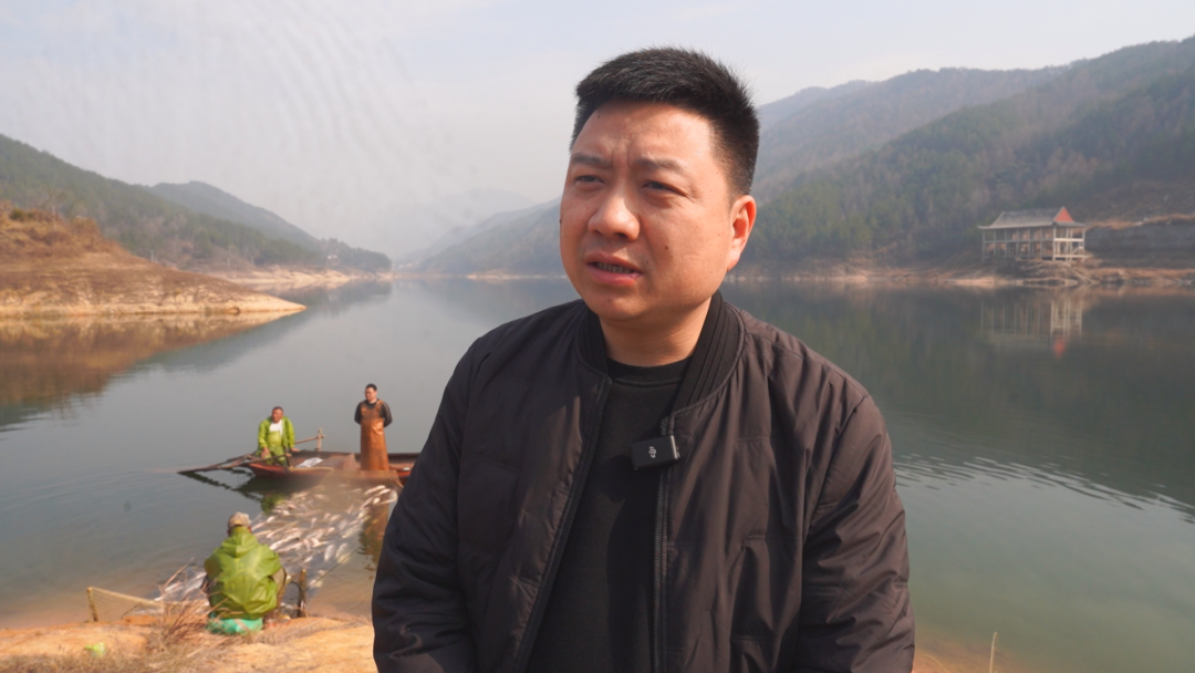 英山县神峰山庄团练冲水库养殖基地负责人 陈武地:打鱼是我们大别山的一个风俗,每到年关的时候,打鱼就意味着丰收,年年有余。我这个水库的鱼是人放天养,自然生长,养了两年,现在基本上是6斤—8斤。