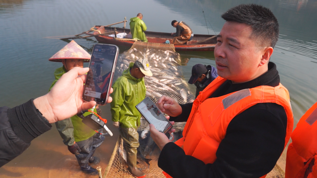 经过捕捞,一条条白鲢鱼、花鲢鱼等被捕捞上岸,场面十分壮观。岸边的围观村民们也响起了欢呼声和呐喊声,纷纷用镜头记录下这精彩的瞬间。与此同时,神峰山庄的带货直播也从室内搬到了室外……
