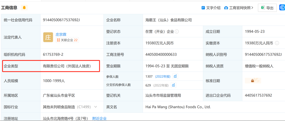 据企查查,海霸王(汕头)食品有限公司成立于1994年5月,法定代表人为庄宗霖,经营范围主要为食品生产及食品销售等。