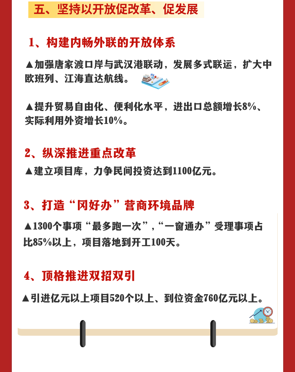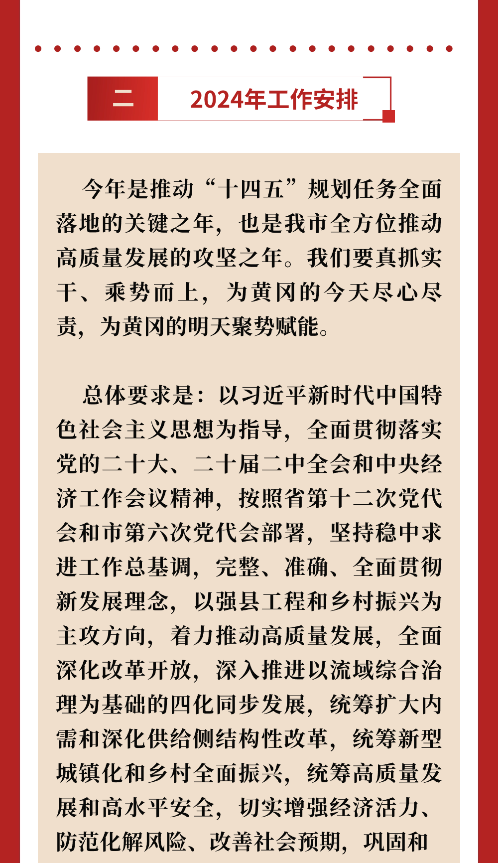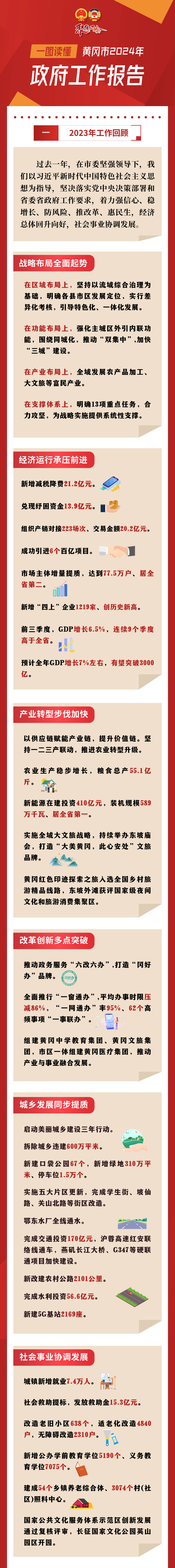 1月9日 黄冈市第六届人民代表大会第四次会议 在黄冈市职工活动中心开幕 市长刘洁代表市人民政府作工作报告 报告主要由2023年工作回顾、2024年工作安排 努力建设人民满意的服务型政府三部分组成 小编带您“一图读懂” ↓↓↓ 来 源:黄冈广播电视台
