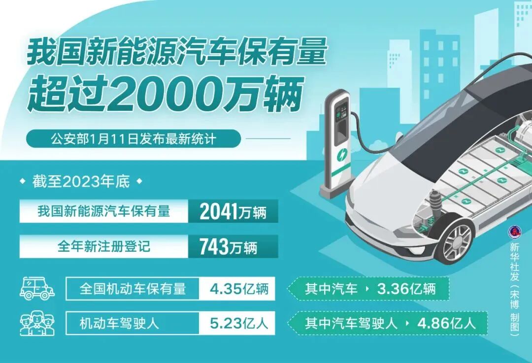 公安部1月11日发布最新统计,截至2023年底,我国新能源汽车保有量达2041万辆。