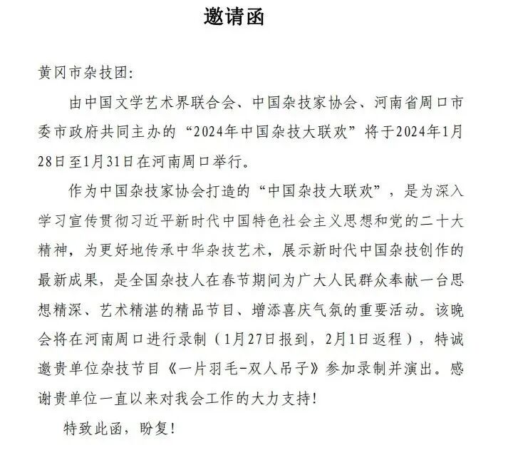 日前,黄冈浠水杂技团收到邀请,将于1月底参加中国杂技家协会举办的“2024年中国杂技大联欢”演出活动。