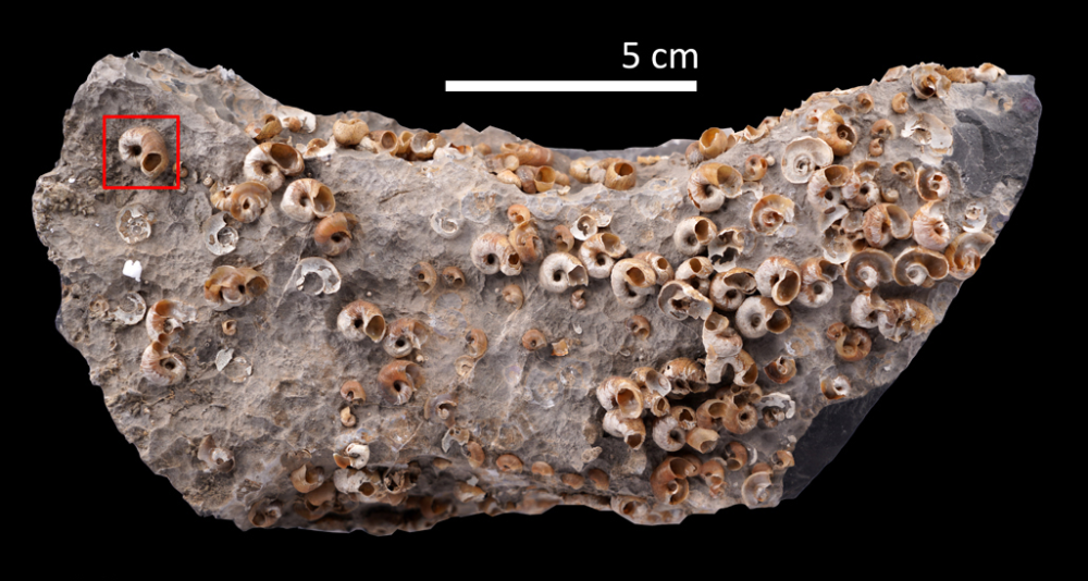 有中华江旋螺固着的石头,红框为选模标本。(张乐嘉 摄)