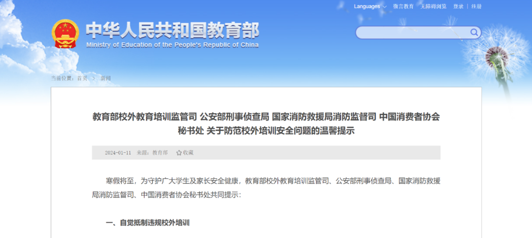 寒假将至,为守护广大学生及家长安全健康,教育部校外教育培训监管司、公安部刑事侦查局、国家消防救援局消防监督司、中国消费者协会秘书处共同提示: