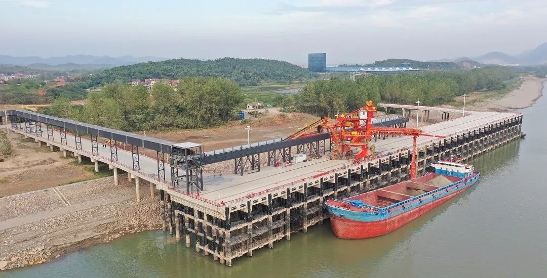 一艘艘货轮缓缓靠泊,冬日阳光照耀下的武穴港充满勃勃生机。黄家山综合码头作业现场,20多米高的港机正在快速运转。砂石骨料沿着蜿蜒的皮带廊道进入港机,然后以每2秒一吨的速度,倾泻至停靠在码头的万吨货轮,随即运往江浙。