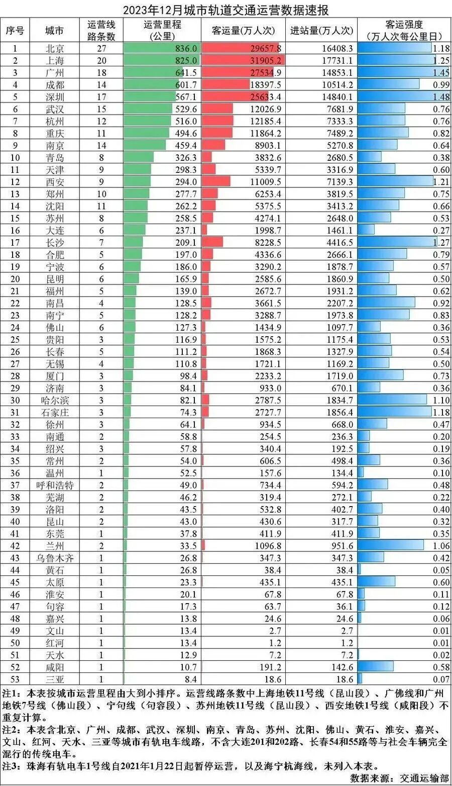 据交通运输部有关负责人介绍,2023年12月,我国城市轨道交通新增运营里程250.1公里,新增运营线路6条,为武汉地铁19号线、重庆地铁18号线、天津地铁11号线、郑州地铁12号线、贵阳地铁3号线、南通地铁2号线;新增运营区段11个,为北京地铁11号线西段剩余段、北京地铁16号线剩余段、北京地铁17号线北段、广州地铁5号线东延段、广州地铁7号线二期、深圳地铁8号线二期、武汉地铁5号线调整工程、南京地铁7号线南段、合肥地铁2号线延长线、合肥地铁3号线延长线、哈尔滨地铁3号线二期西北半环(中华巴洛克街区站至北马路站)。