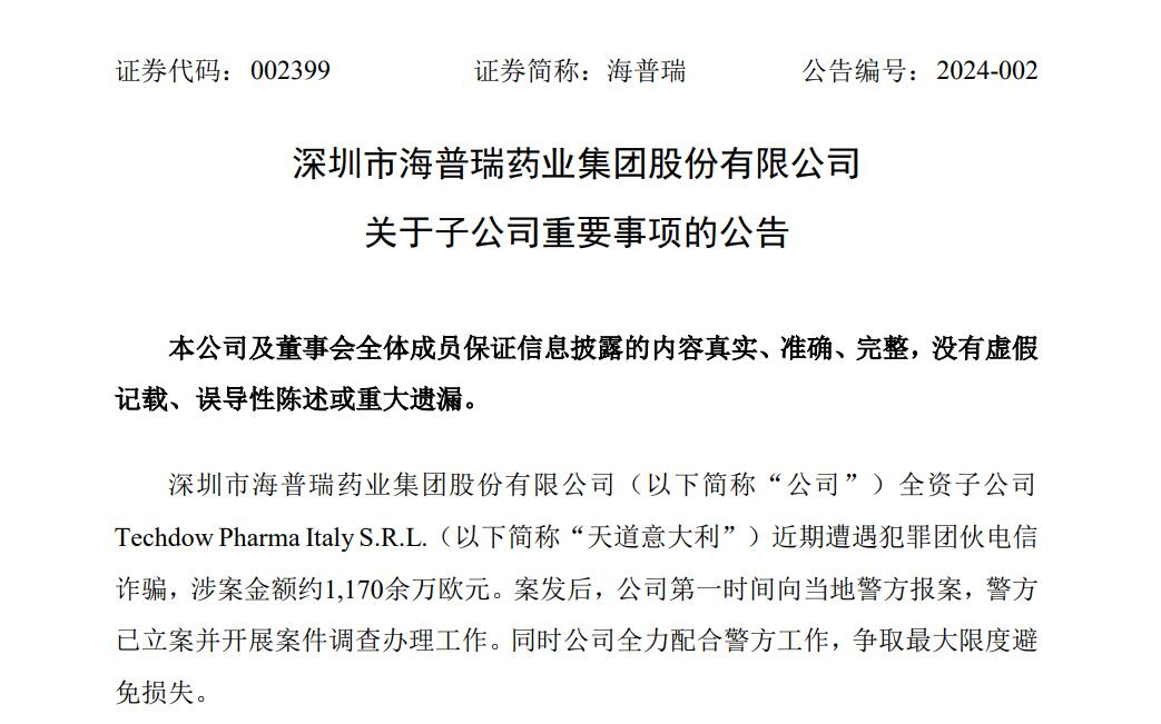 1月14日晚间,海普瑞在深交所公告,公司全资子公司Techdow Pharma Italy S.R.L.(简称“天道意大利”)近期遭遇犯罪团伙电信诈骗,涉案金额约1170余万欧元(约人民币9180万元)。案发后,公司第一时间向当地警方报案,警方已立案并开展案件调查办理工作。同时公司全力配合警方工作,争取最大限度避免损失。