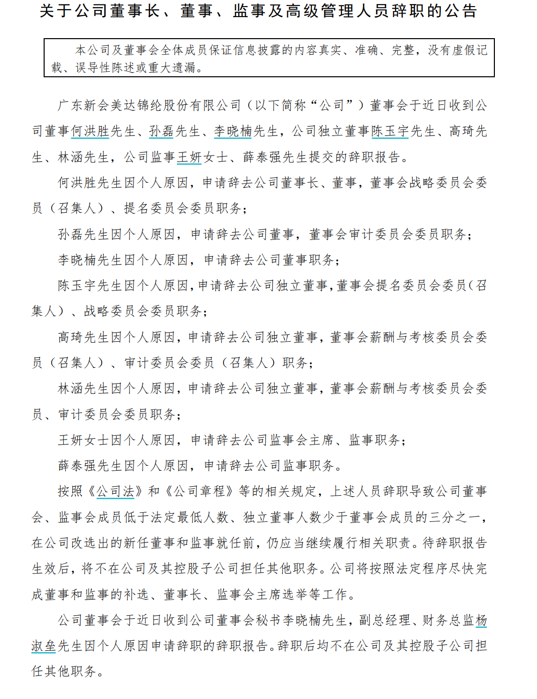 美达股份14日晚间公告披露,董事长何洪胜等10名董监高集体辞职。