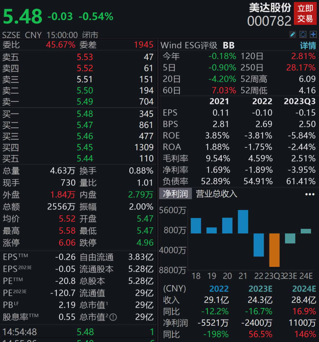 业绩方面,2023年前三季度,美达股份营收20.29亿元,同比下降9.71%;归属于上市公司股东的净利润亏损8011.77万元,同比由盈转亏,较2022年同期下降2282.93%。