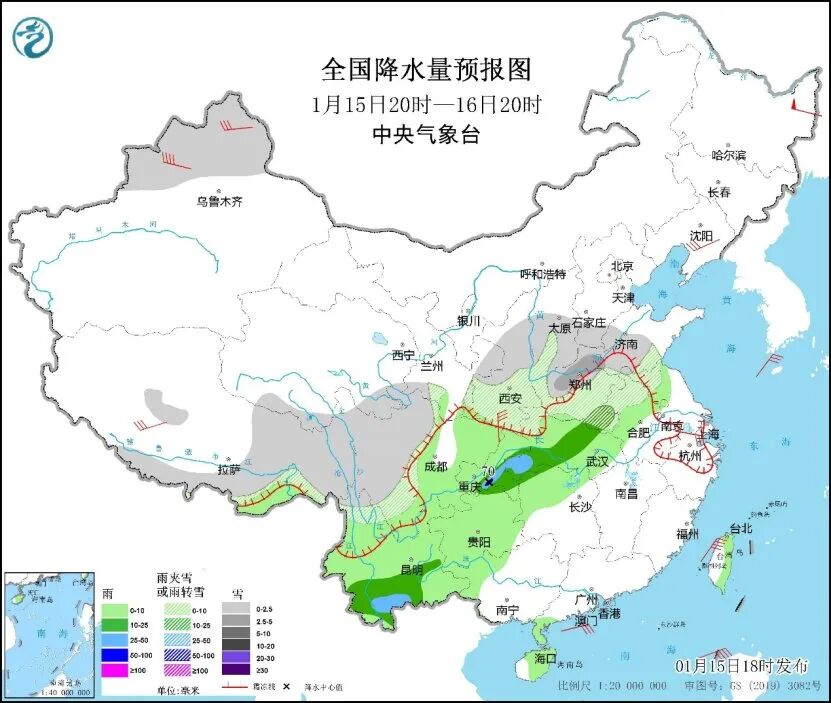 中央气象台预计,15日20时至16日20时,新疆北部、西藏东部和南部、川西高原、甘肃西南部、陕西大部、山西中南部、河北南部、河南、山东西部等地部分地区有小到中雪或雨夹雪,陕西南部、河南西部、湖北西北部等地局地有冻雨;西南地区、江汉、江淮、江南西部、广西西部、海南岛、台湾岛东部等地部分地区有小到中雨,其中云南中南部、重庆中部、湖北西部和中部等地部分地区有大雨,局地暴雨。