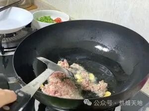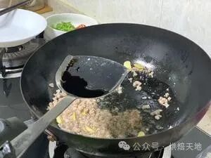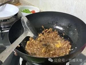 2、姜蒜片炒香后放入准备好的肉沫翻炒,加入少许白胡椒粉,加入少许老抽上色。