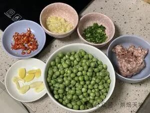 豌豆360克、肉末90克、小米椒3个、蒜片5片、姜片4片、葱花2根、蒜末5瓣(剁细一些)、老抽1小勺、生抽1勺、白胡椒粉适量、盐适量