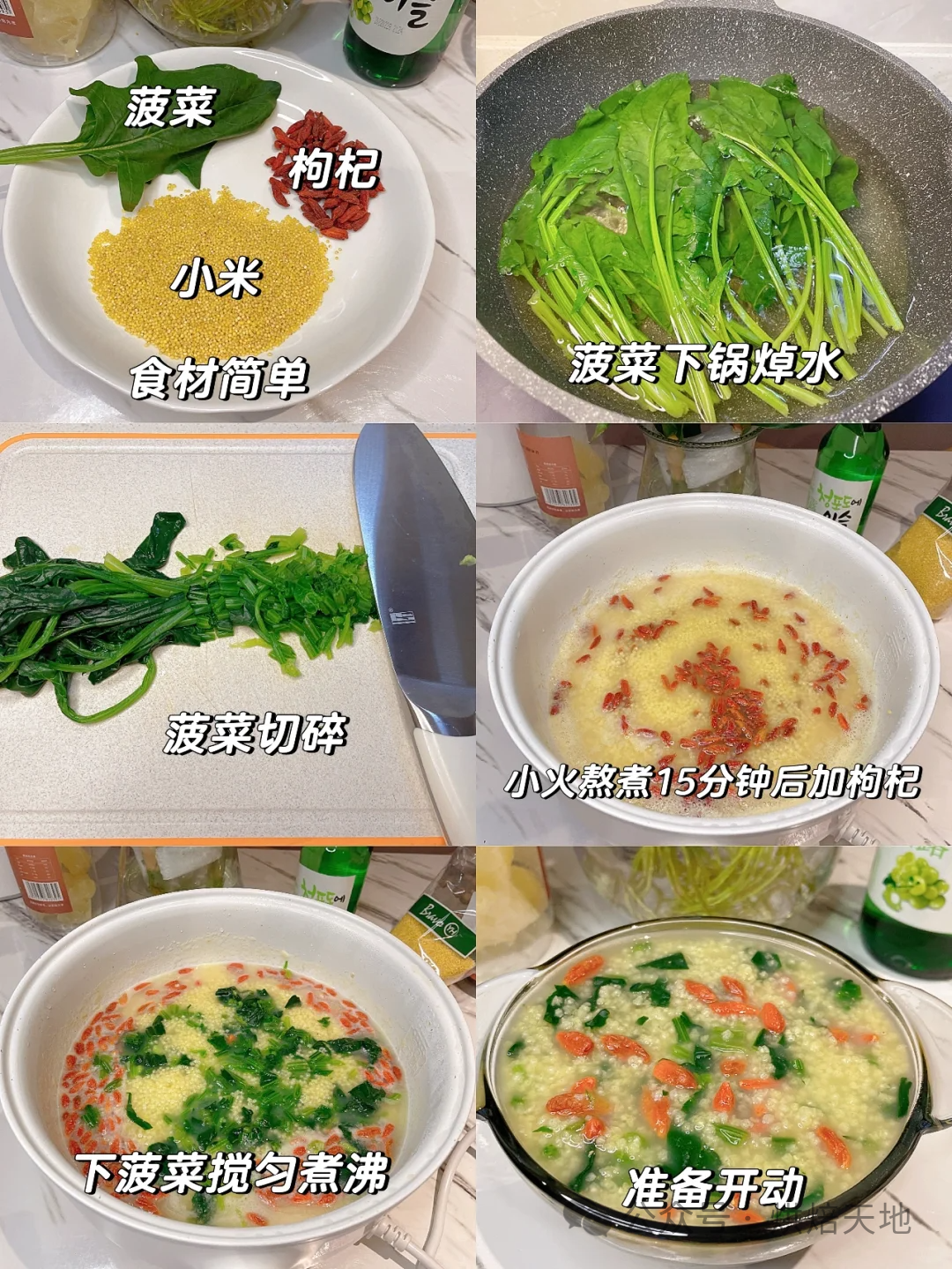 食材菠菜、小米各100克,枸杞子15克(两人的份量)做法1、菠菜清洗干净,焯水捞出切小段;小米、枸杞洗干净砂锅/电煮锅中倒入小米,加入适量清水,大火煮开后改小火继续熬煮15分钟,倒入枸杞煮至小米软烂,下入菠菜段搅匀煮沸即可