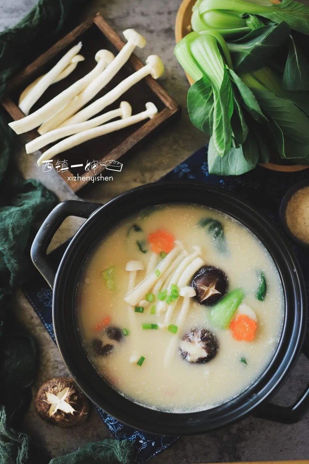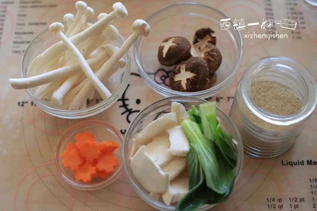 材料:干黄豆80克,清水1000克左右,白玉菇1小把,香菇4-5朵,杏鲍菇1/2根,胡萝卜片7-8片,小油菜一小把,食盐3克,自制味精1克(没有可省略),葱花少许