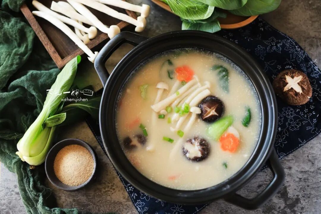 豆浆富含蛋白质和钙,还有丰富的维生素,简直就是最便宜的营养品。所以用豆浆做的汤要比普通汤更为浓稠,特别是加入盐和少许调味料后,那乳白色的汤汁很像用鲫鱼熬煮很久的鱼汤味道浓郁。再加点时蔬菌菇进去一起煮,浓郁的豆香味加上菌菇的鲜,十足鲜美