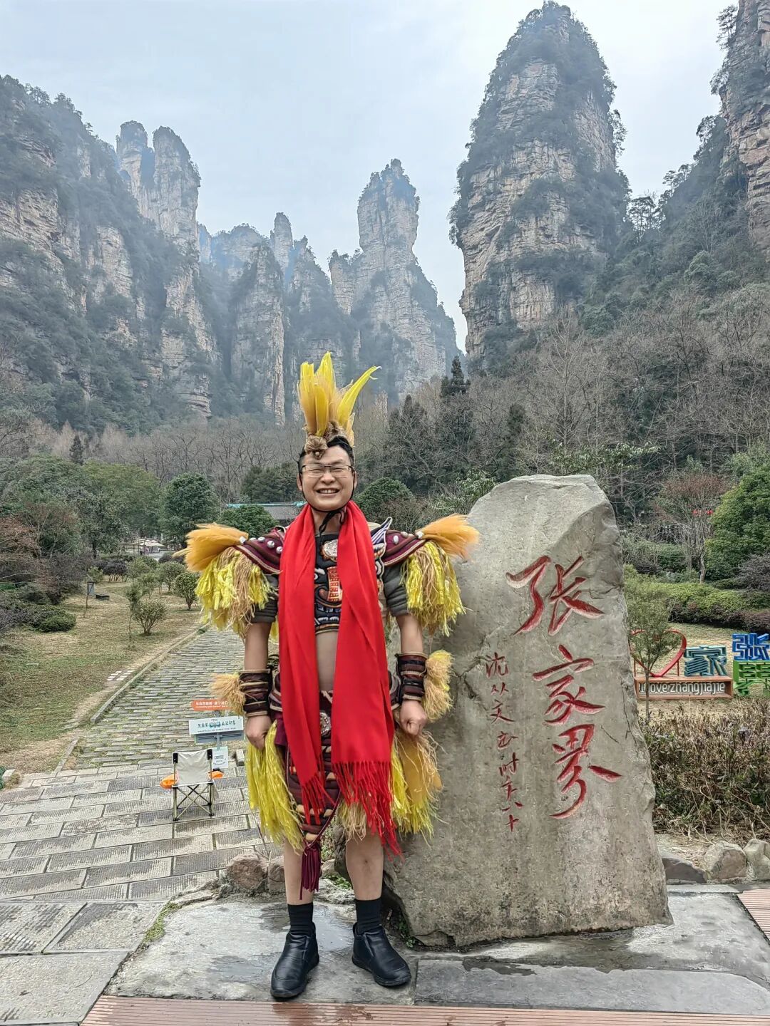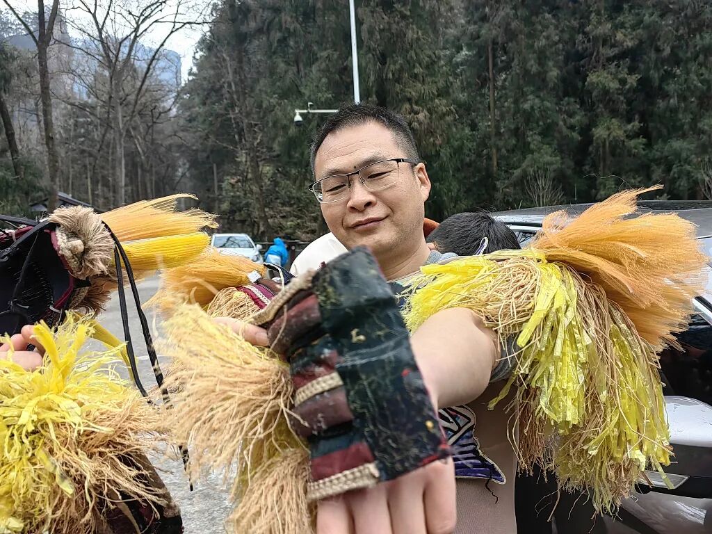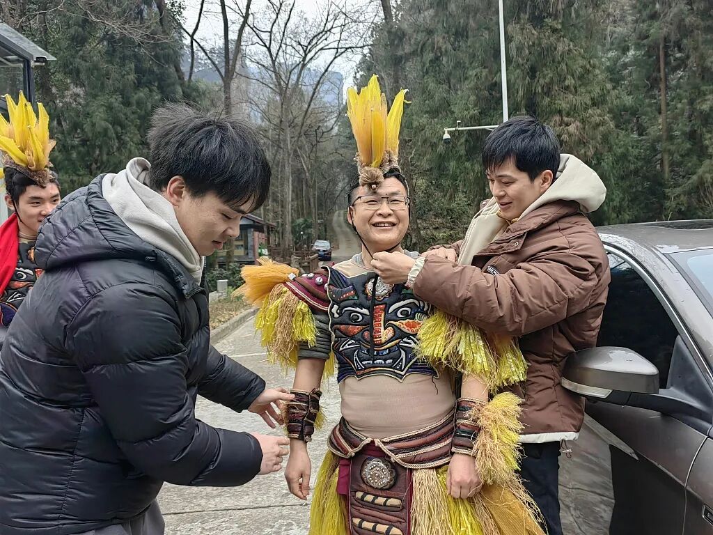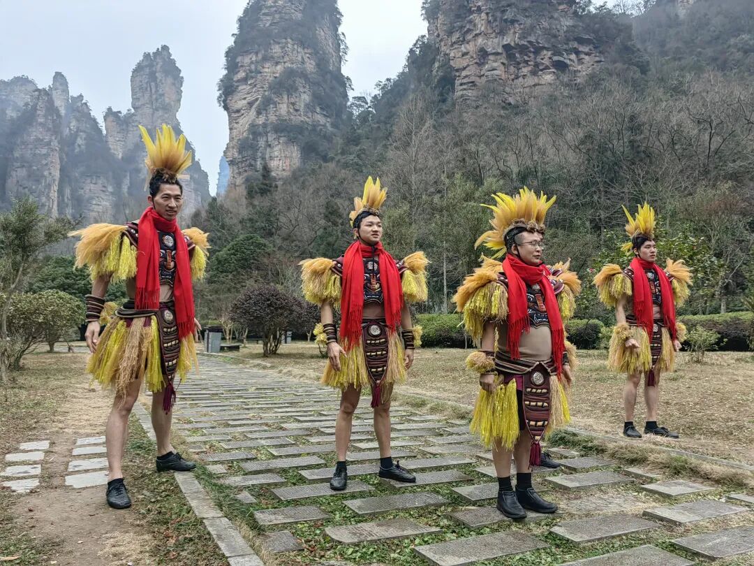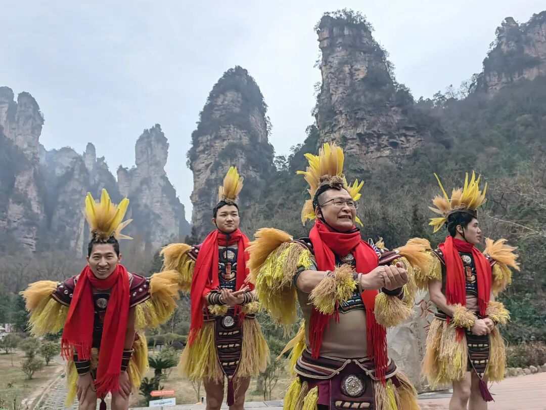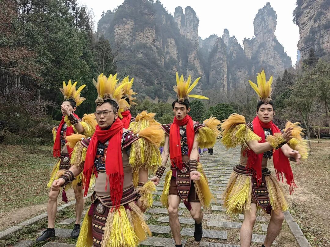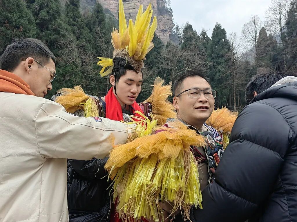 当日,天气寒冷,进入景区的游客们都穿着厚厚的棉衣,“茅古斯”们身着象征茅草的茅古斯装束,脖子上戴着红围巾。“张家界,申请出战!”伴随着音乐,彭振华和演员们一起跳起了时下流行的“科目三”。