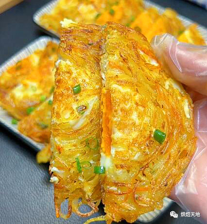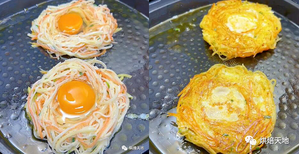 土豆鸡蛋饼 此款土豆鸡蛋饼和之前的土豆胡萝卜丝饼做法基本一致,只不过是配料比有点不同,本次用的是淀粉,而且量也少了一些,吃起来更有土豆和胡萝卜丝的味道。还有在煎饼的时候,是先不开火,把土豆丝整理成鸟窝状后再开火,这样能较好的整理成圆形,做出的饼才更圆更好看。