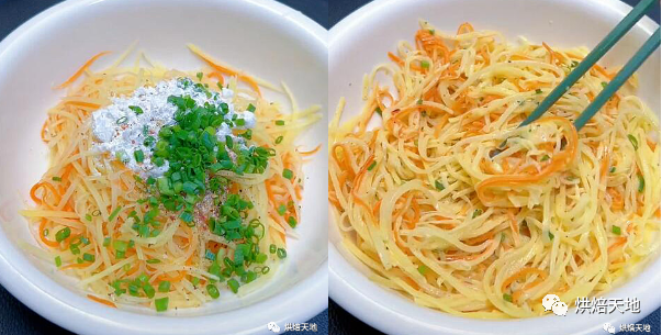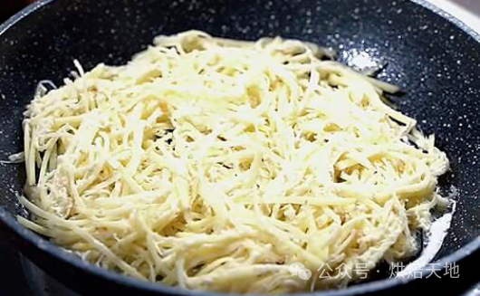 ☆土豆丝尽量切细一点,这样煎的时候更快。