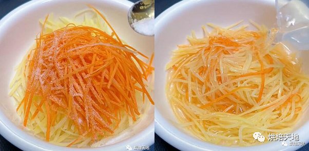 1、把土豆和胡萝卜切丝(尽量切细一点,也可以用切丝工具切)