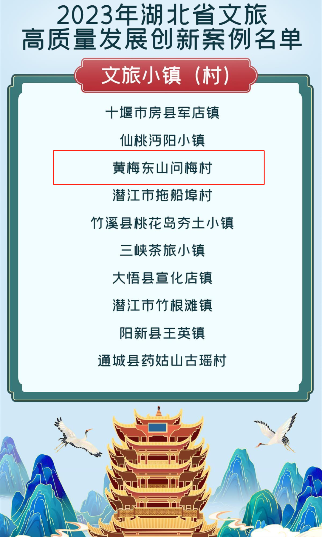 近日,湖北省文旅高质量发展创新案例评选结果揭晓,经过线上投票和专家评审等环节,最终评选出十大类别共95个优秀案例。黄梅东山问梅村入选湖北省文旅高质量发展创新案例。