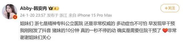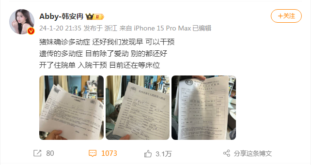 随后,韩安冉再次发文称,“刚发了视频,猪妹的10分钟,真的一秒不停的动,确实是需要住院干预了。”